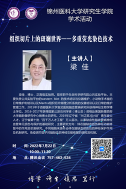 研究生学院学术活动(第七讲)于7月22日10:00召开,邀请嘉宾为梁佳正高级实验师,报告题目为“组织切片上的斑斓世界——多重荧光染色技术”。请研究生学院全体人员、各培养单位分管研究生教育副院长及科长,导师和研究生扫描海报二维码参加活动。会议要求如下: