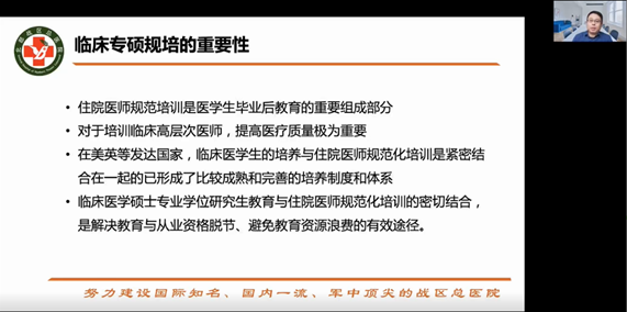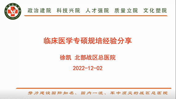 中国人民解放军北部战区总医院徐凯作题为《临床医学研究生规培经验分享》的报告。报告结合工作实际,介绍了规范过程管理对研究生规培的必要性,介绍了提高带教导师业务水平、提升研究生学习热情的重要性,介绍了提升规培质量的多种渠道,对规培与科研的关系进行了细致讲解,尤其介绍了规培过程中常见的矛盾问题,并对问题进行了细致剖析,提出了独到见解。
